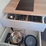 Les commodités comprennent un réfrigérateur et de la verrerie fournis dans une cuisine équipée pour préparer vos propres repas.